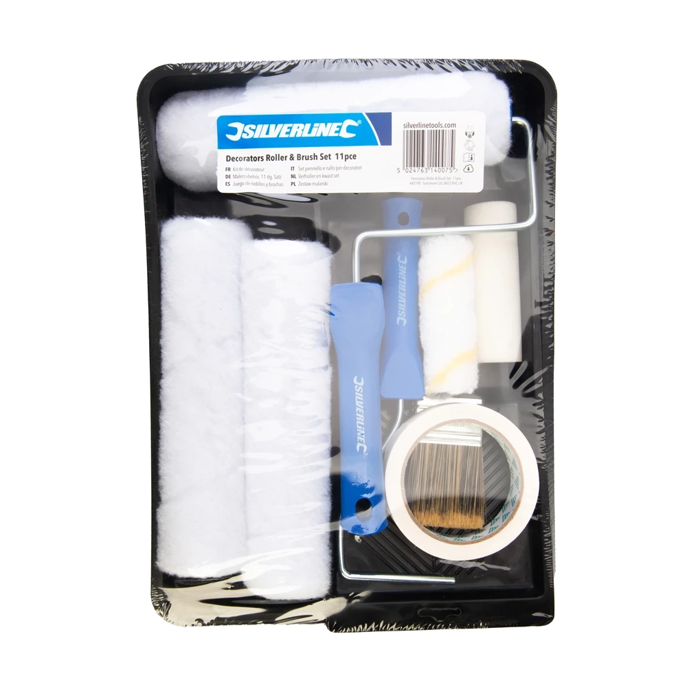 Ensemble d’accessoires de décorateur composé de 11 pièces utiles pour réaliser des travaux de peinture et de décoration intérieure ou extérieure. Ce kit est compatible avec les manchons de rouleaux standards (100 mm et 230 mm) et regroupe des outils essentiels pour appliquer peinture, lasure, enduit ou tout autre revêtement liquide sur murs, plafonds ou surfaces planes.