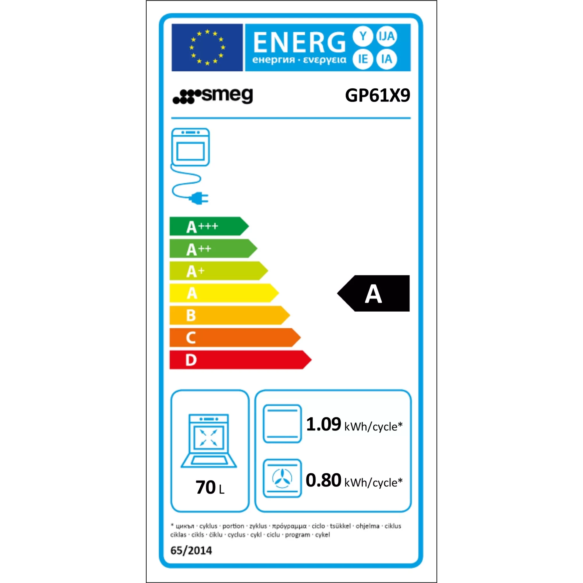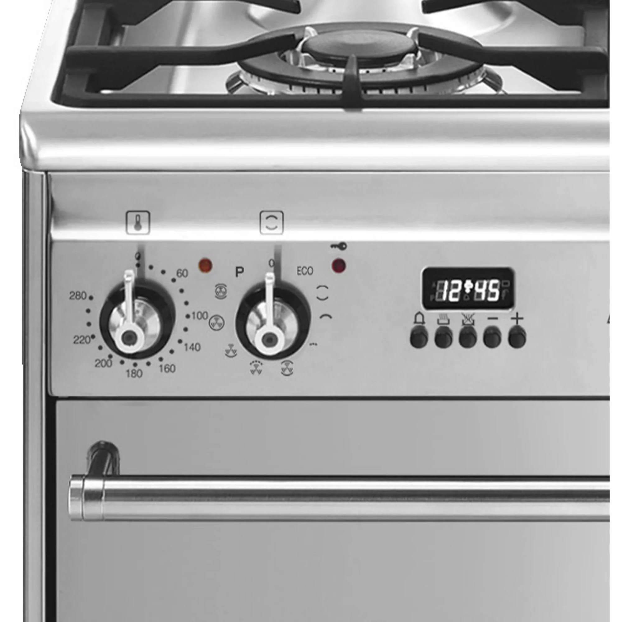 La cuisinière gaz Smeg GP61X9 est une solution de cuisson mixte alliant la précision du piano de cuisson gaz et les performances d’un four électrique multifonction. Conçue pour les cuisines modernes, elle offre quatre brûleurs gaz puissants, un four spacieux de 70 L avec fonctions avancées comme chaleur tournante, gril et pyrolyse auto-nettoyante, ainsi qu’un design inox élégante facile à intégrer dans tous les intérieurs. Grâce à son énergie performante (classe A) et ses fonctionnalités ergonomiques, cette cuisinière garantit des résultats rapides, précis et économes pour tous types de recettes, du rôti délicat aux pizzas croustillantes.