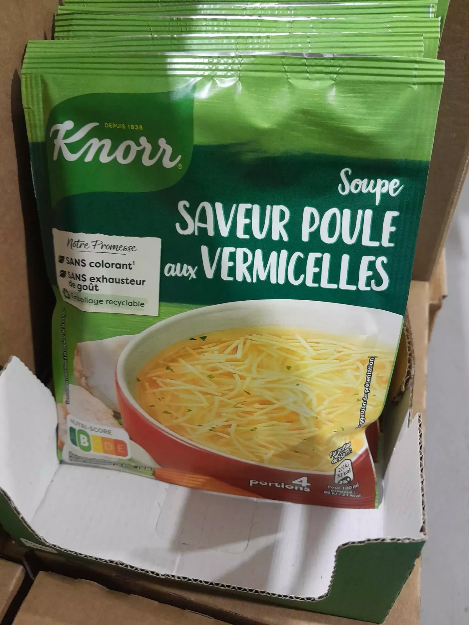 La soupe Knorr saveur poule vermicelle est une soupe chaude et réconfortante, associant un bouillon goût poule à de fins vermicelles. Facile et rapide à préparer, elle est idéale pour un repas léger ou une entrée.