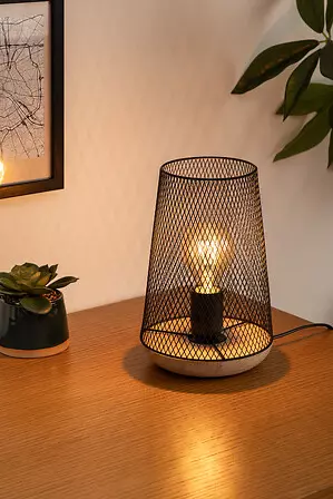 La lampe Zely associe harmonieusement le métal grillagé noir et le bois pour un style industriel et chaleureux. Son abat-jour ajouré laisse passer la lumière tout en créant de jolis jeux d’ombres. Elle est idéale pour apporter une touche décorative moderne sur une table de chevet, un bureau ou un meuble d’appoint.