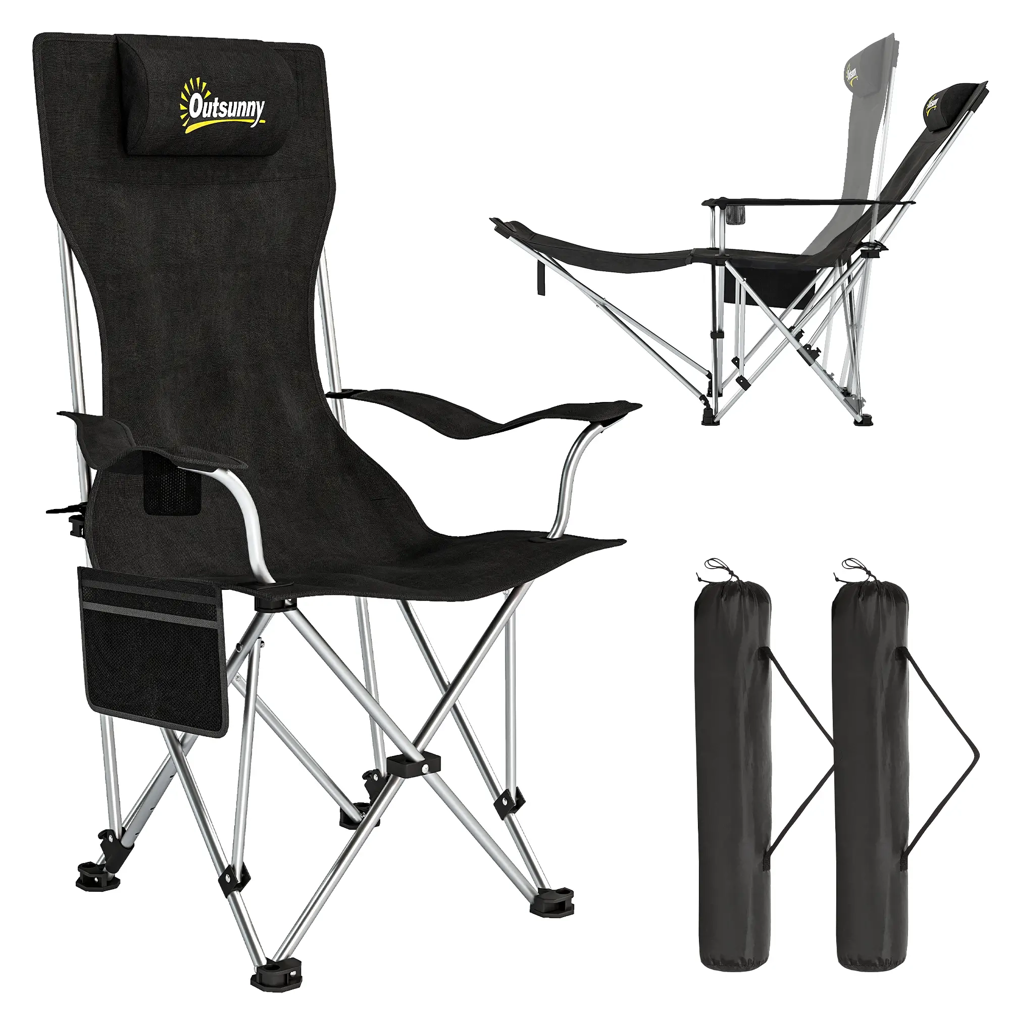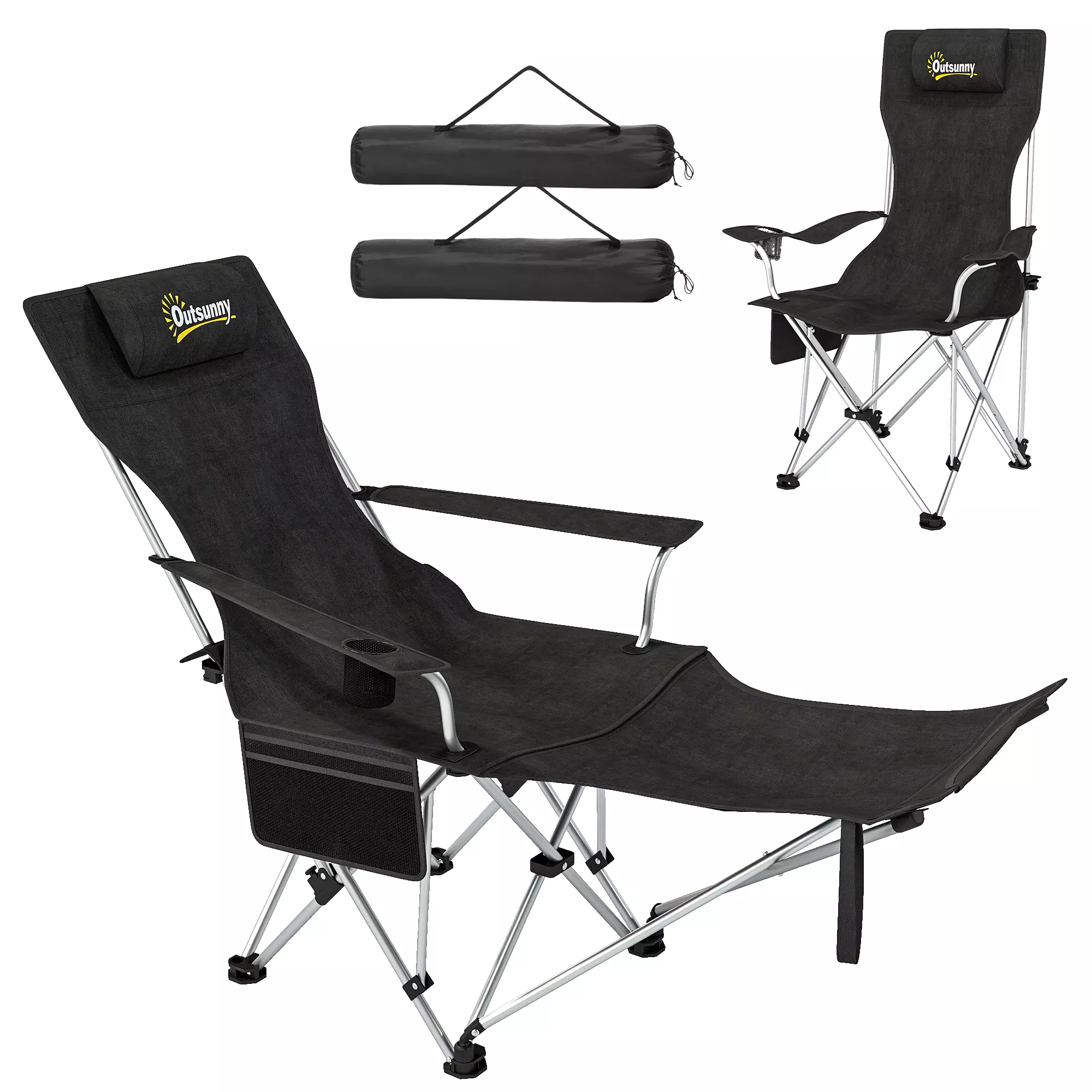 Lot de 2 chaises de camping pliante inclinable avec repose-pieds, sac de rangement, porte-gobelet et appui-tête, noir