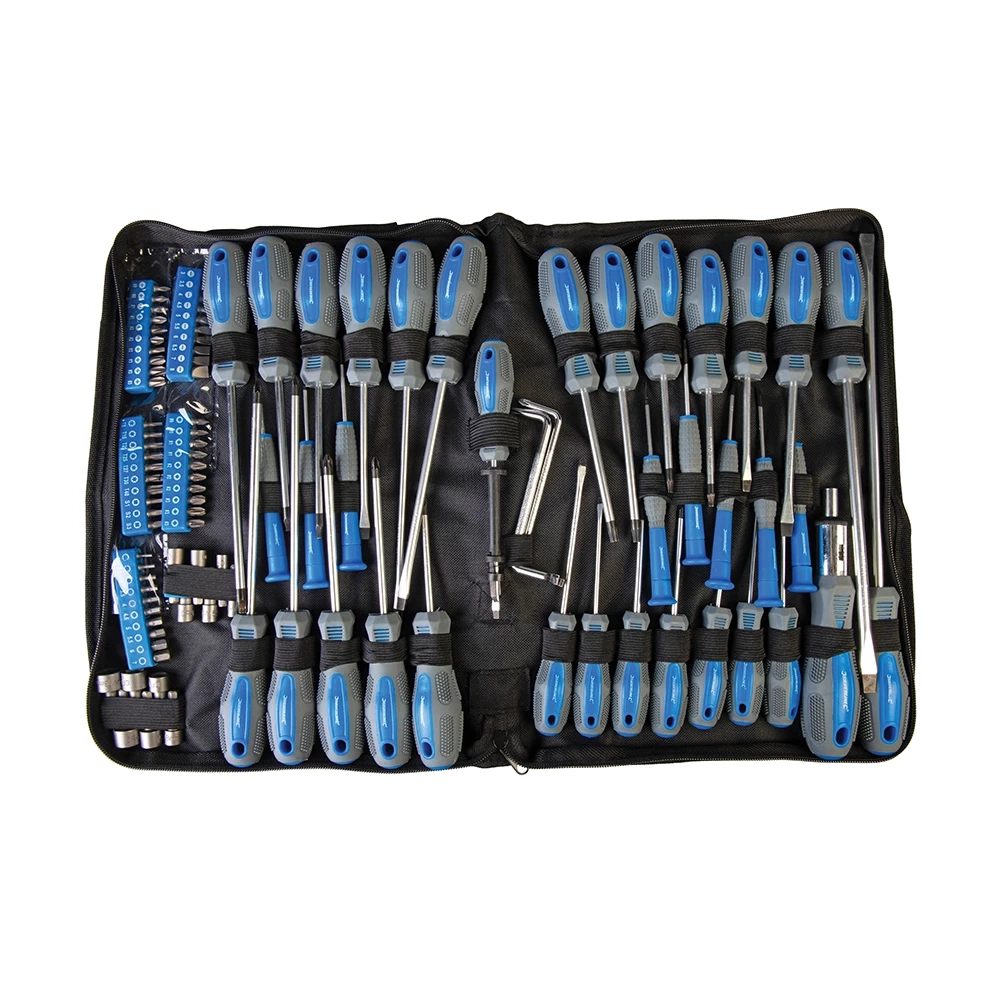 100 pièces complètes incluant tournevis, embouts, tourne-écrous et outils divers.