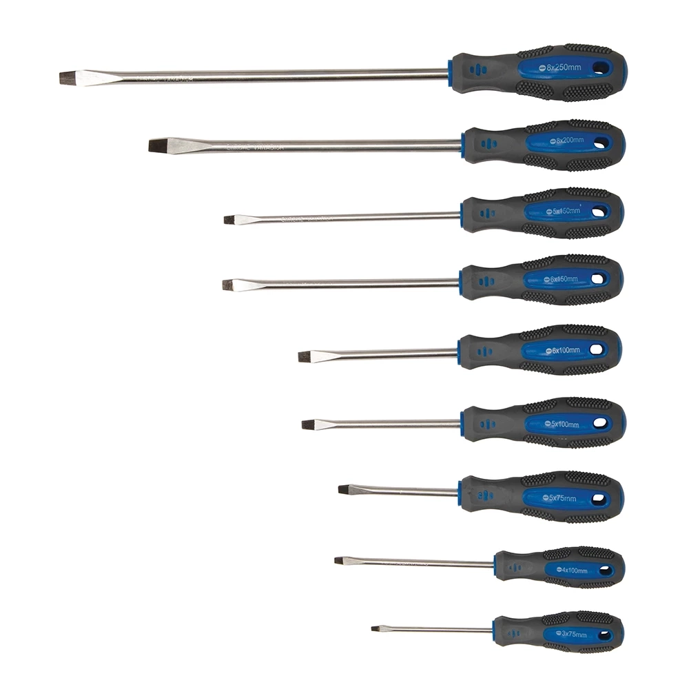 9 tournevis plats : tailles de lame de 3 mm à 8 mm avec longueurs allant de 75 à 250 mm.